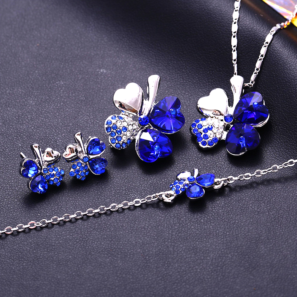 ✤Four Leaf Clover Necklace Set✤-This fashion charm bracelet set includes 1 lucky clover necklace, 1 four leaf clover bracelet, 2 blue crystal earrings, they are layed of high-quality alloy and crystal, not easy to break, polished well, ideal fashion jewellery bracelets for girls, suitable for daily wear, party, or any special occasions. Lucky clover crystal necklace set, necklace and earring sets for women