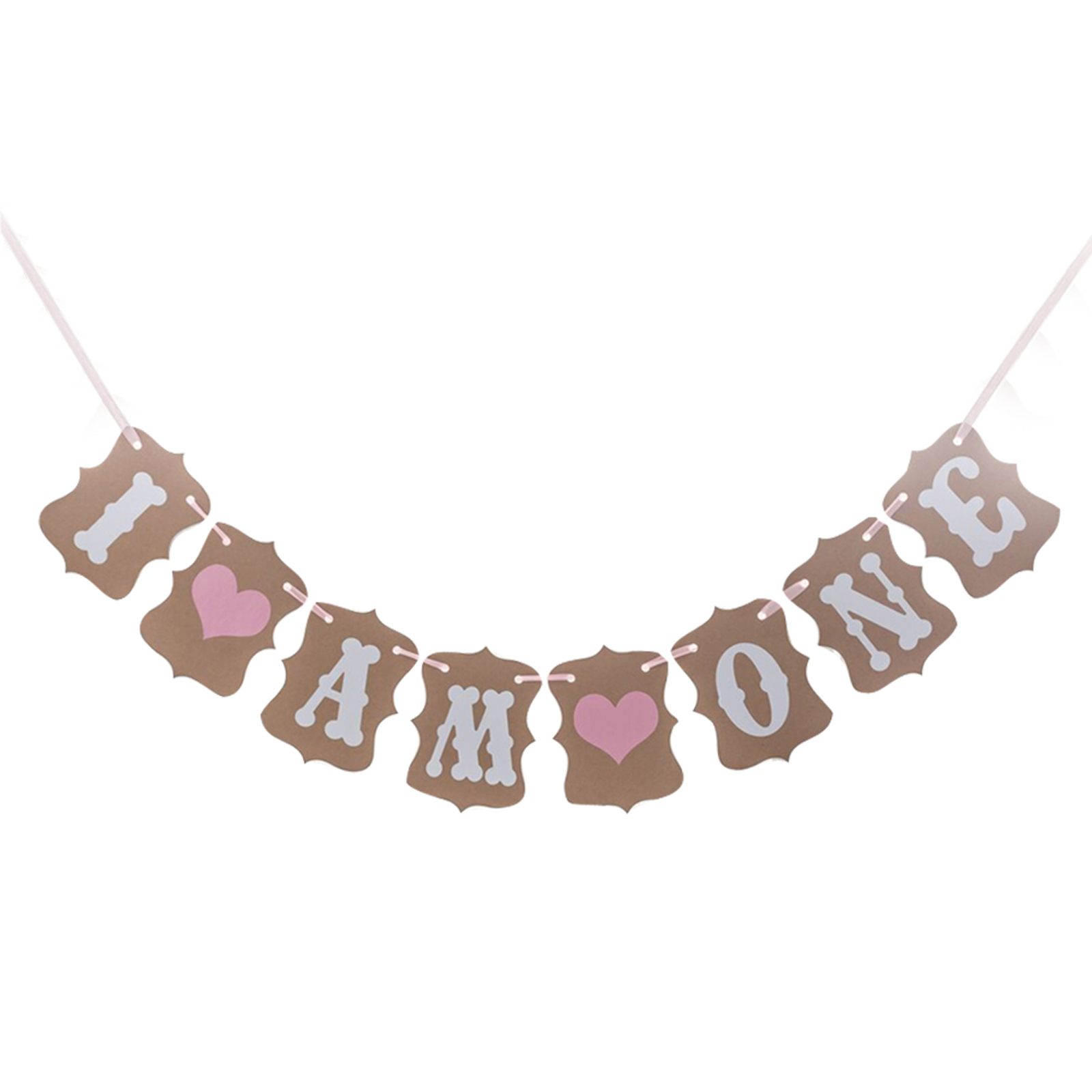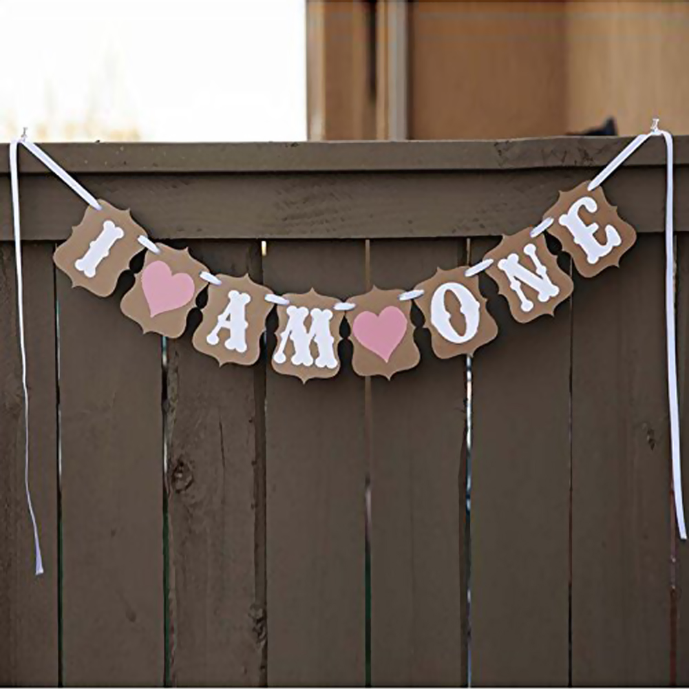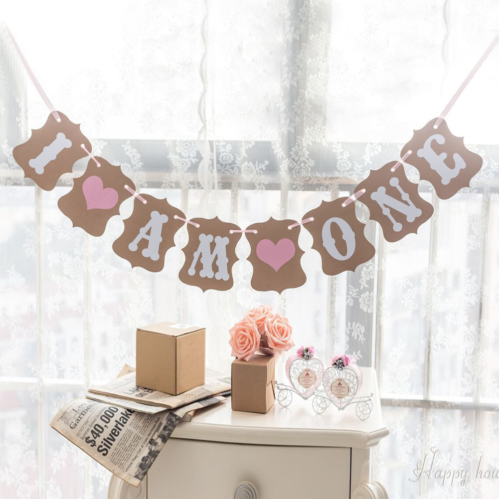✿One Year Old Birthday Banner: Made with 8 individual papers. 6 white letters are ""I AM ONE"", writing by artistic techniques, and two love heart patterns in the middle.