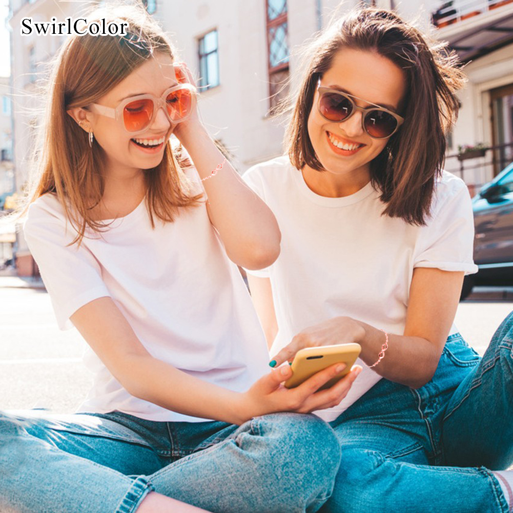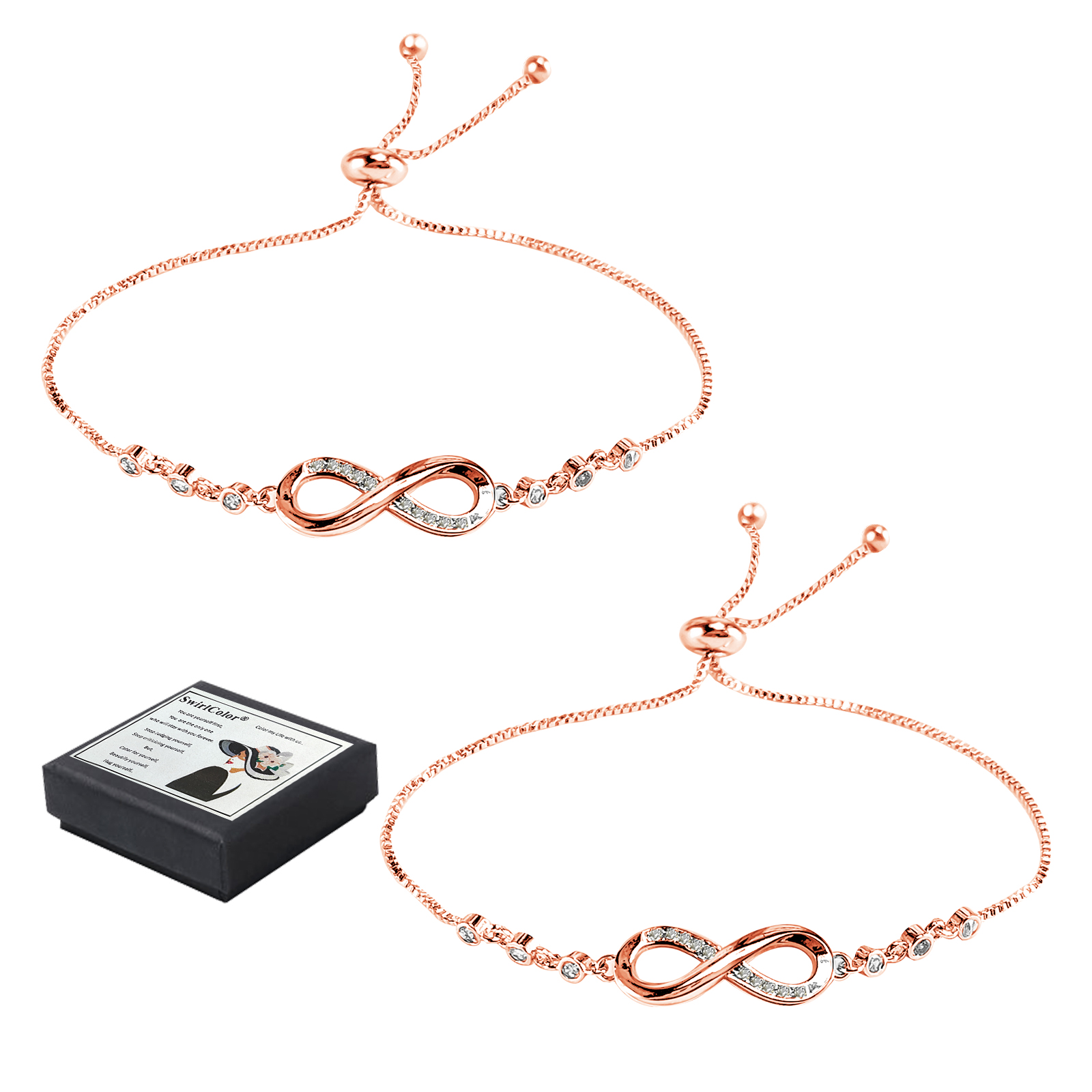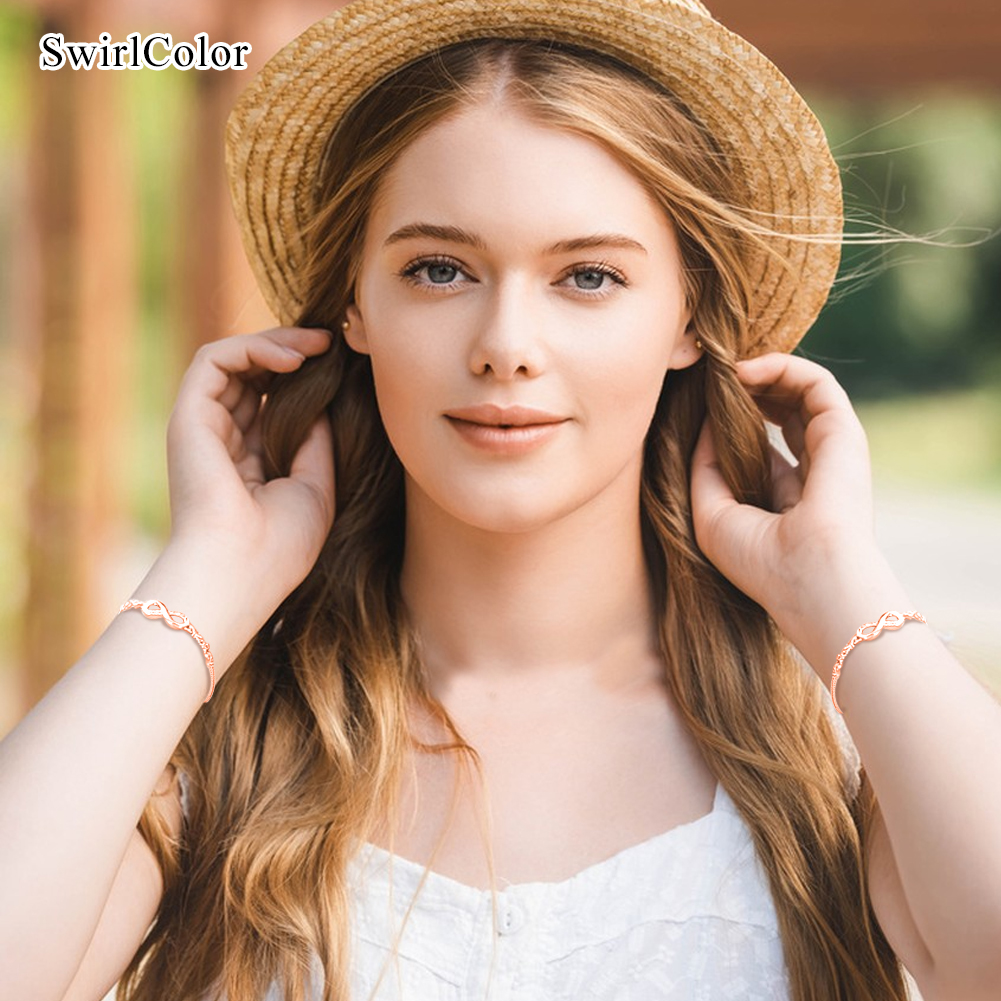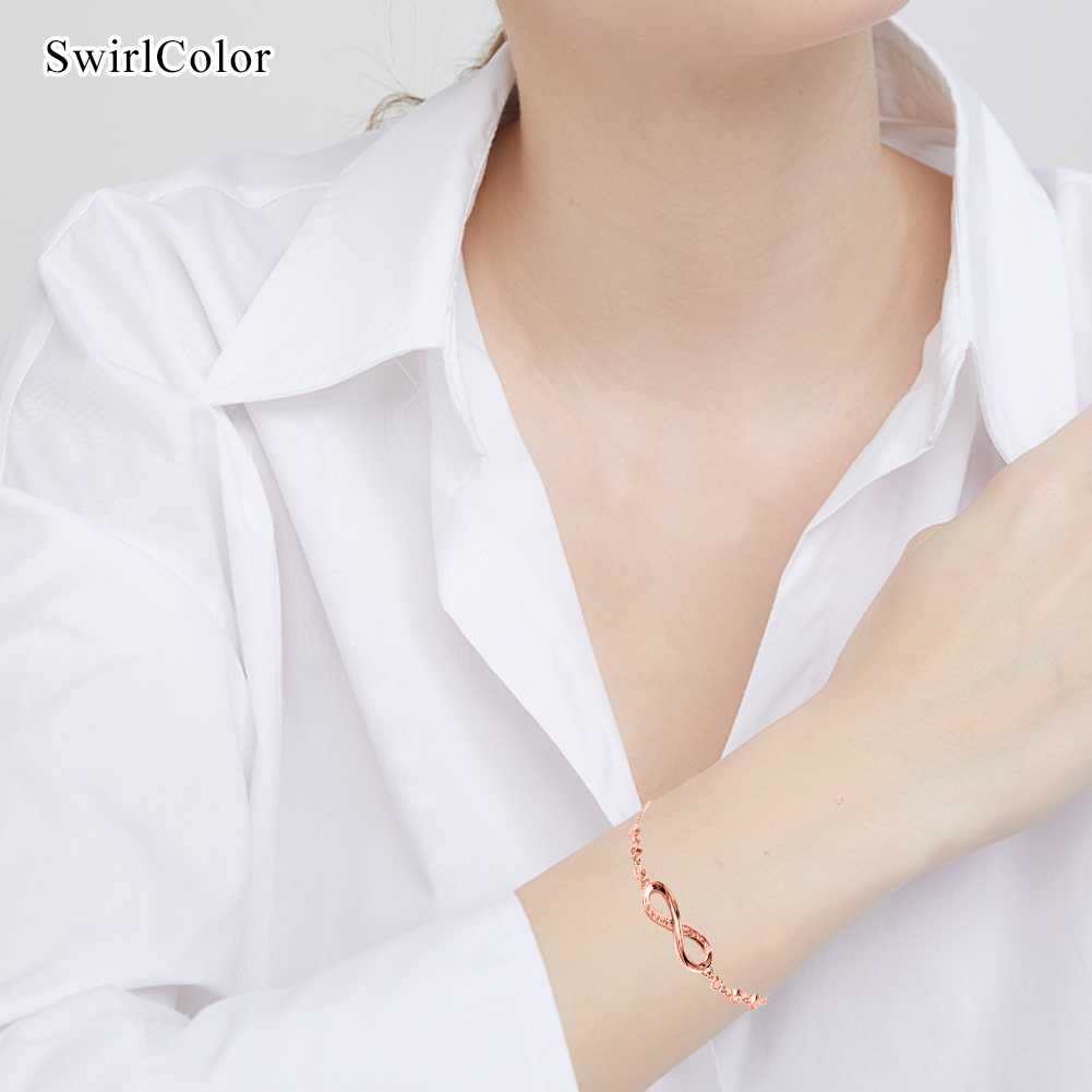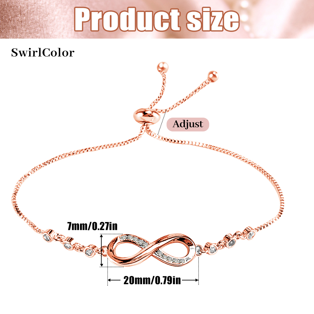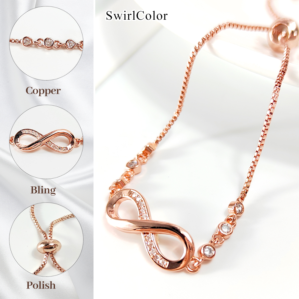 â Infinity Bracelets: The infinity bracelet kit has a special meaning. It represents the forever connection between you, an ideal gift for friends, families, girlfriend, wife, sister, mom etc. SwirlColor Bracelets.â Elegant & Attractive: Rose gold infinity bracelet, inserted with zircon and decorative beads, chic and elegant, great to show women' fascination. SwirlColor Bracelets.â Fine Workmanship: Of excellent craftsmanship and through finely polished, all of our slider bracelet chain has smooth and bright surface, comfortable to wear. SwirlColor Bracelets.â Maintenance Advice: â‘ Avoid chemicals, moisture, impact; â‘¡ When sweating or bathing, do not wear; â‘¢ Store the bracelet jewelry appropriate; â‘£ Wipe with a soft cloth if needed. SwirlColor -