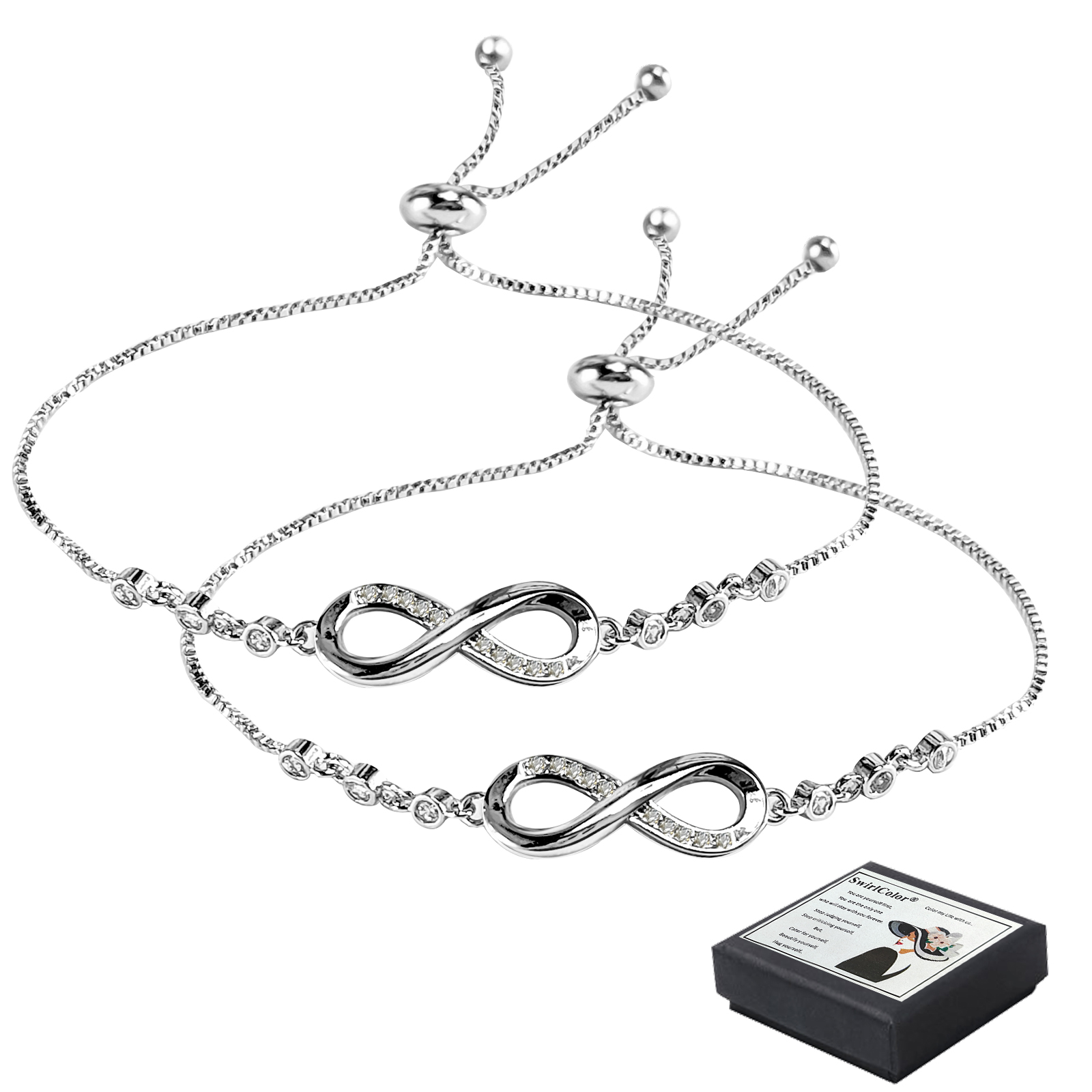 ღ Fine Workmanship: Of excellent craftsmanship and through finely polished, all of our slider bracelet chain has smooth and bright surface, comfortable to wear. Package include: 2 x infinity charm bracelet, 1 x jewelry box. SwirlColor Infinity Bracelets